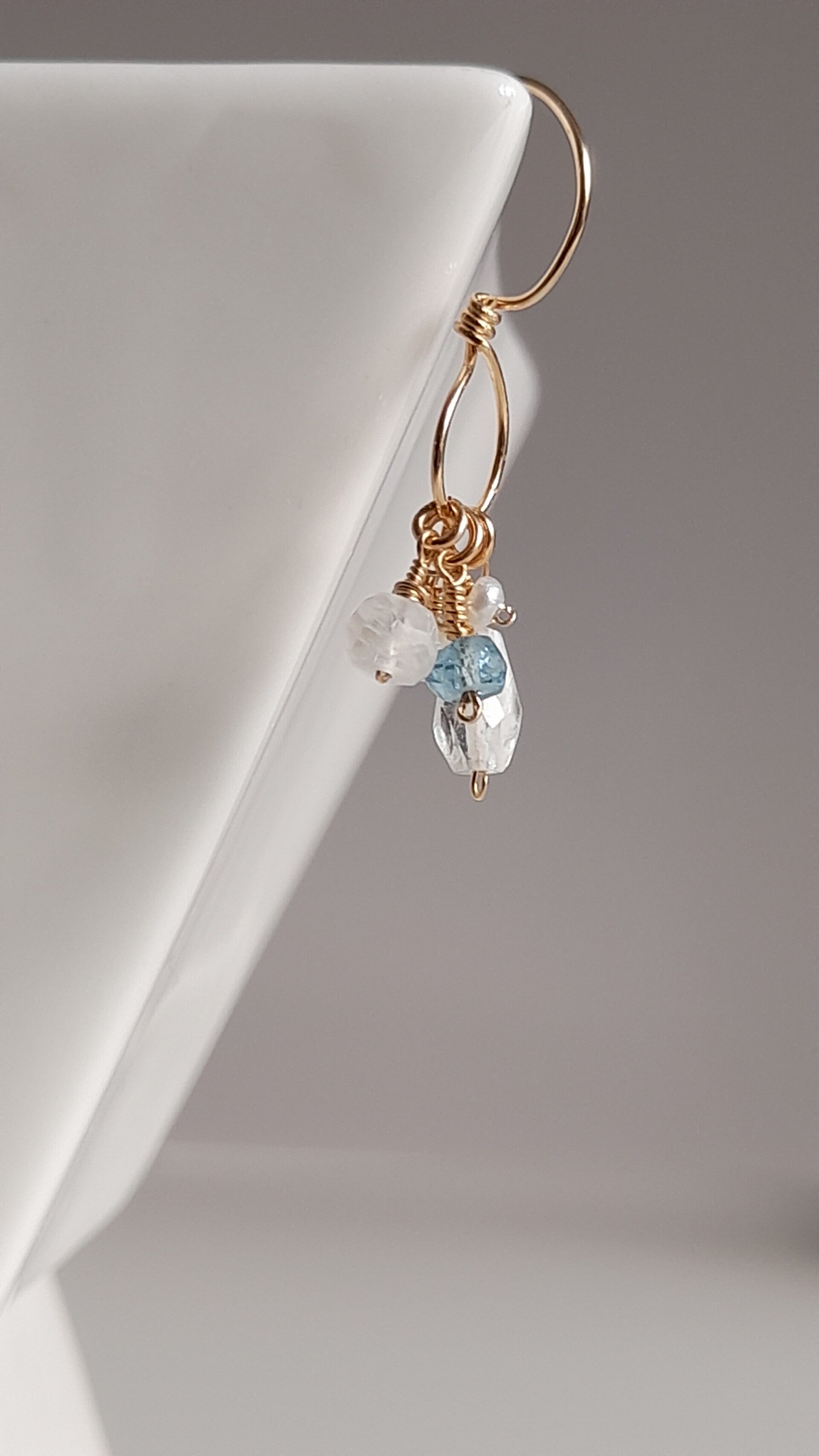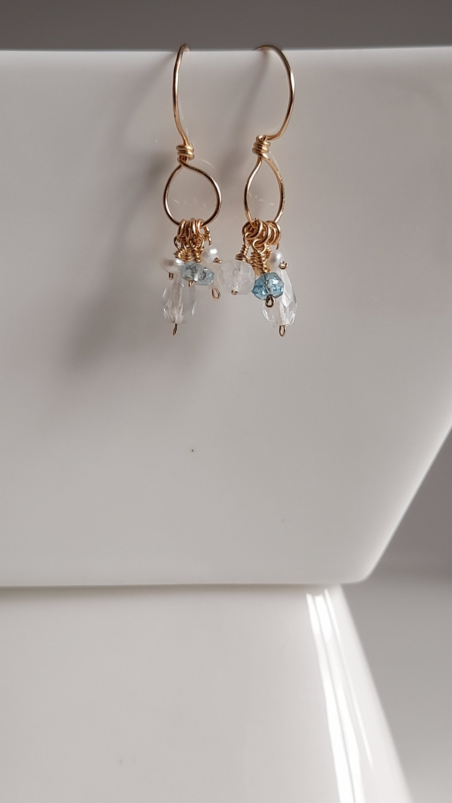 These Gorgeous Earrings feature Beautifully Faceted AAA Clear Quartz Crystal Briolettes, Faceted AAA Moonstone & Aquamarine Rondelles & AAA Pearls clustered on a 14ct Gold Filled Closed Circle Ear Hook.