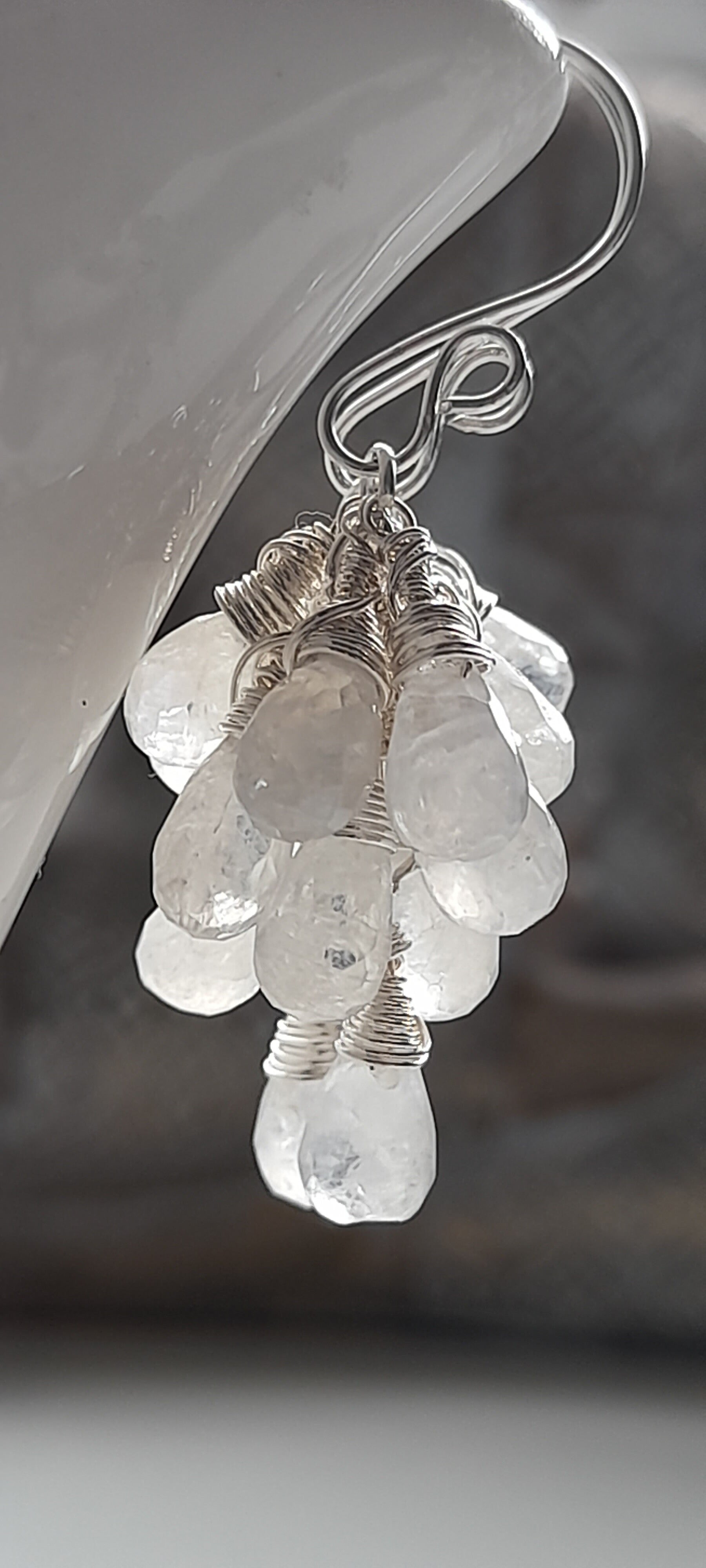 Crisp Winter White Moonstone Drops with flashes of Blue Fire are individually hand wrapped in Sterling Silver, then clustered on Hand crafted Sterling Silver Ear Hooks.