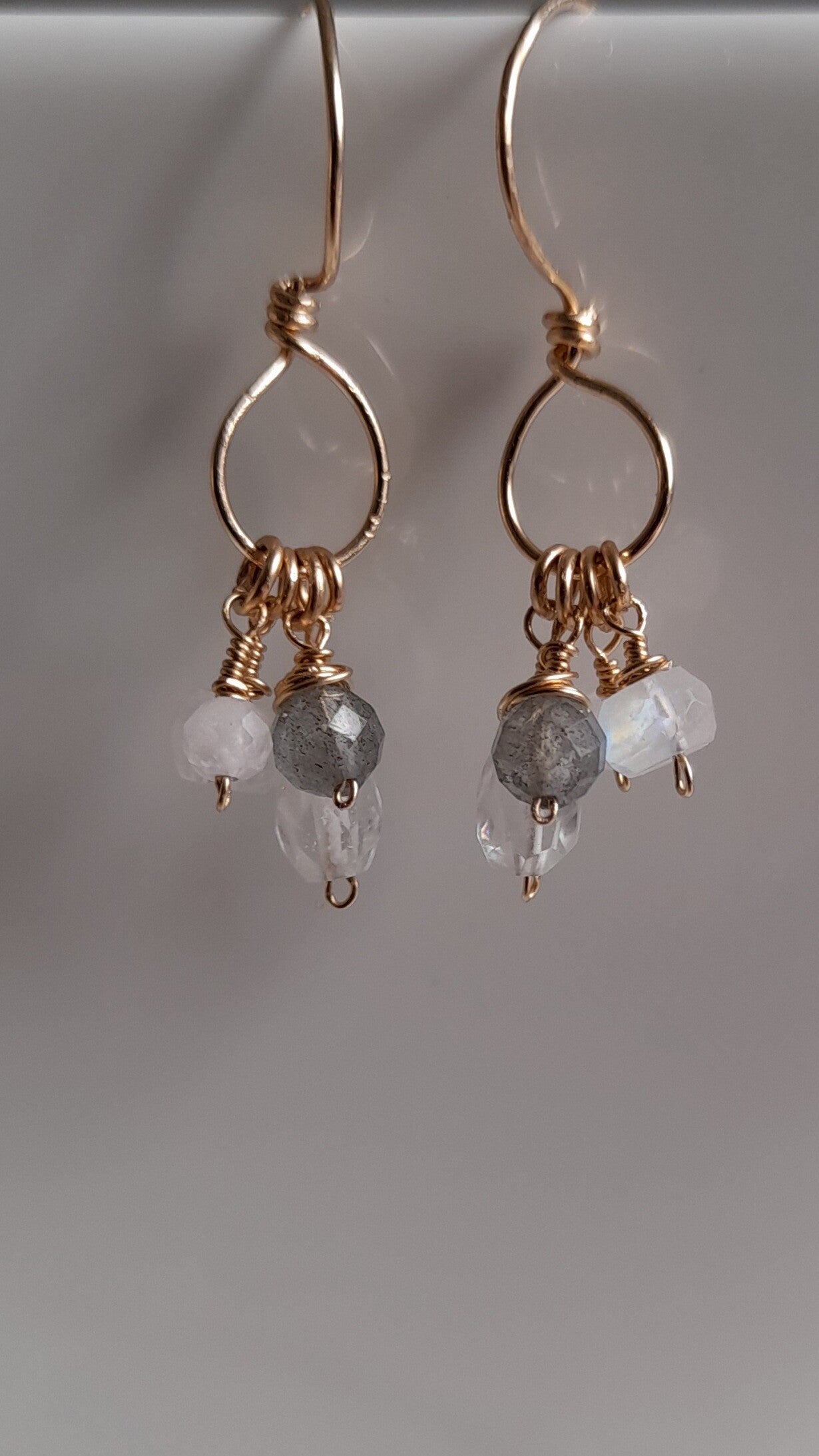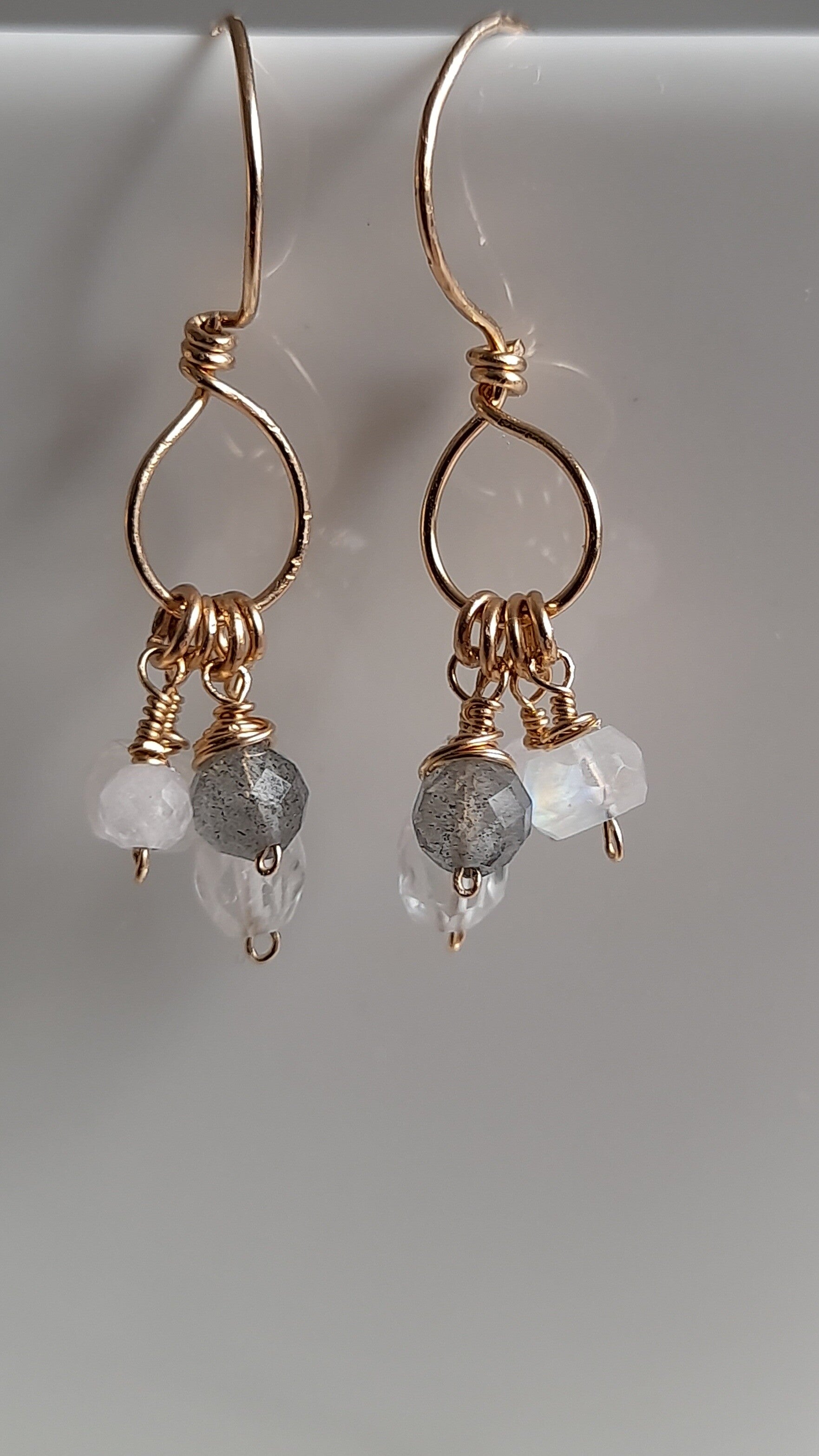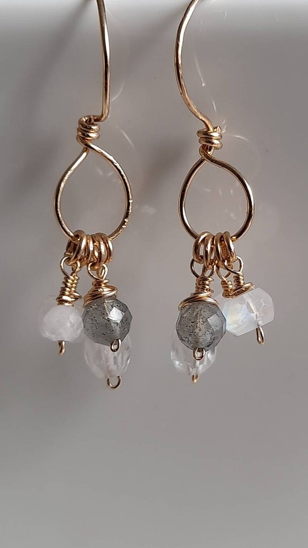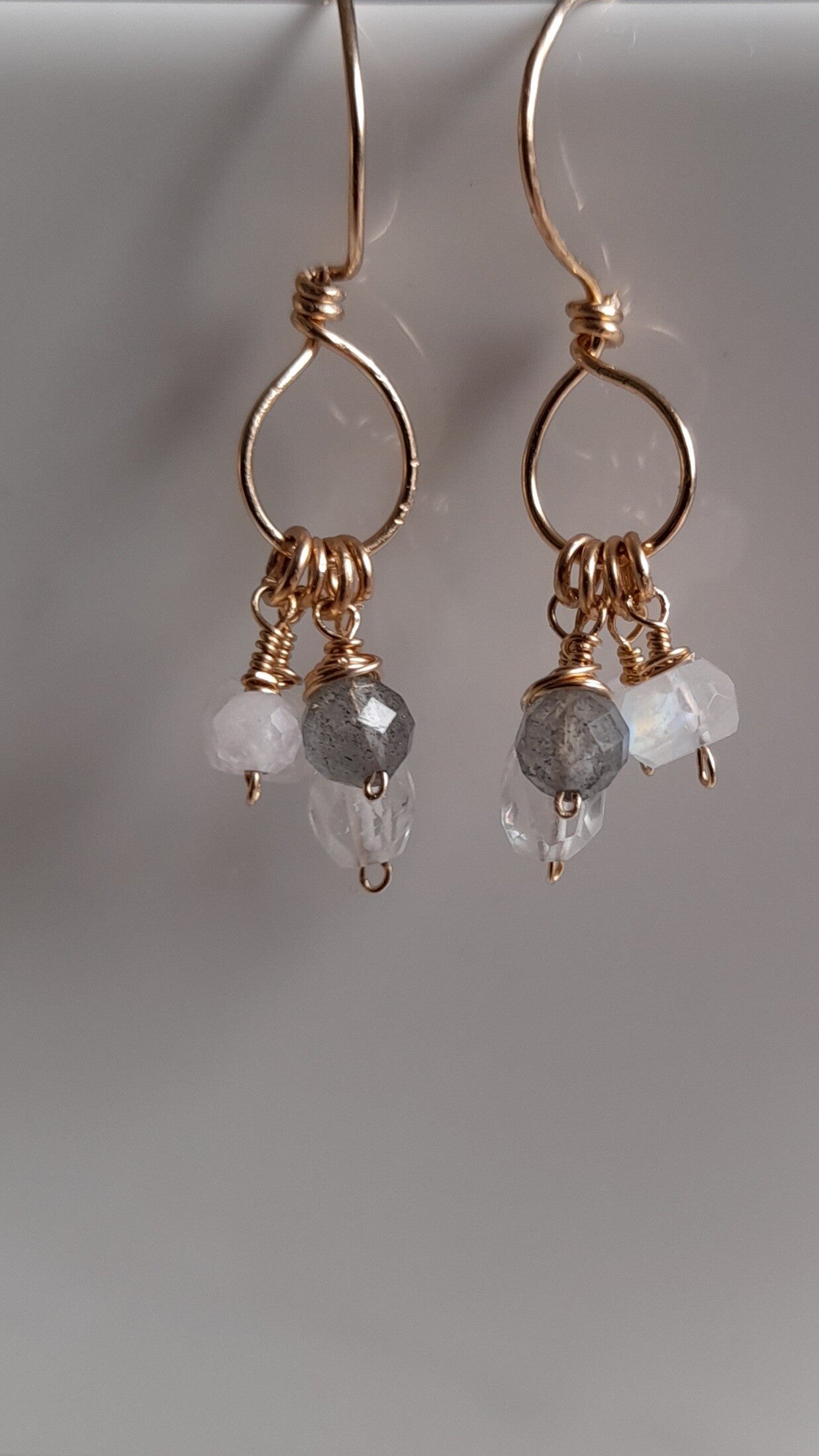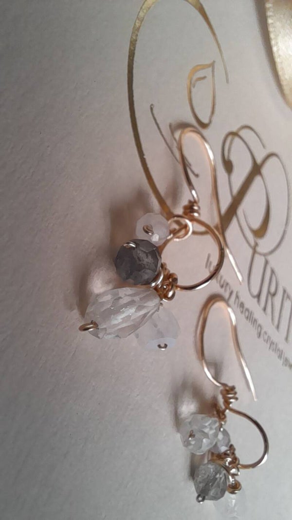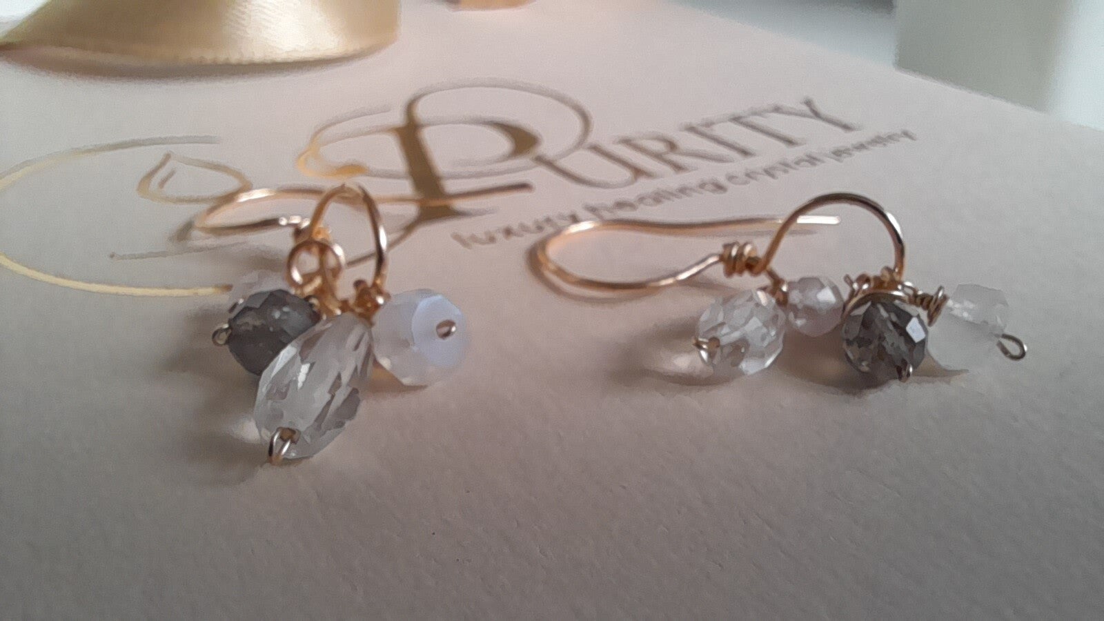 These Beautiful Earrings feature GORGEOUS GREY & WHITE LABRADORITE (Moonstone) CLEAR QUARTZ & LAVENDER QUARTZ CRYSTALS clustered on Closed Circle 14ct Gold Filled Ear Hooks. An up-to-the-minute hugely versatile Earring that adds WOW to any look.