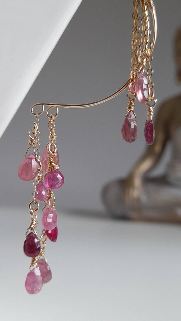 A DOUBLE LAYER OF STUNNING PINK SAPPHIRE CRYSTALS suffused with light Dangle Gracefully on 14ct Gold Filled Chain From 14ct Gold Filled Open 3/4 Hoops in a Boho Style for Free Spirits Everywhere ...